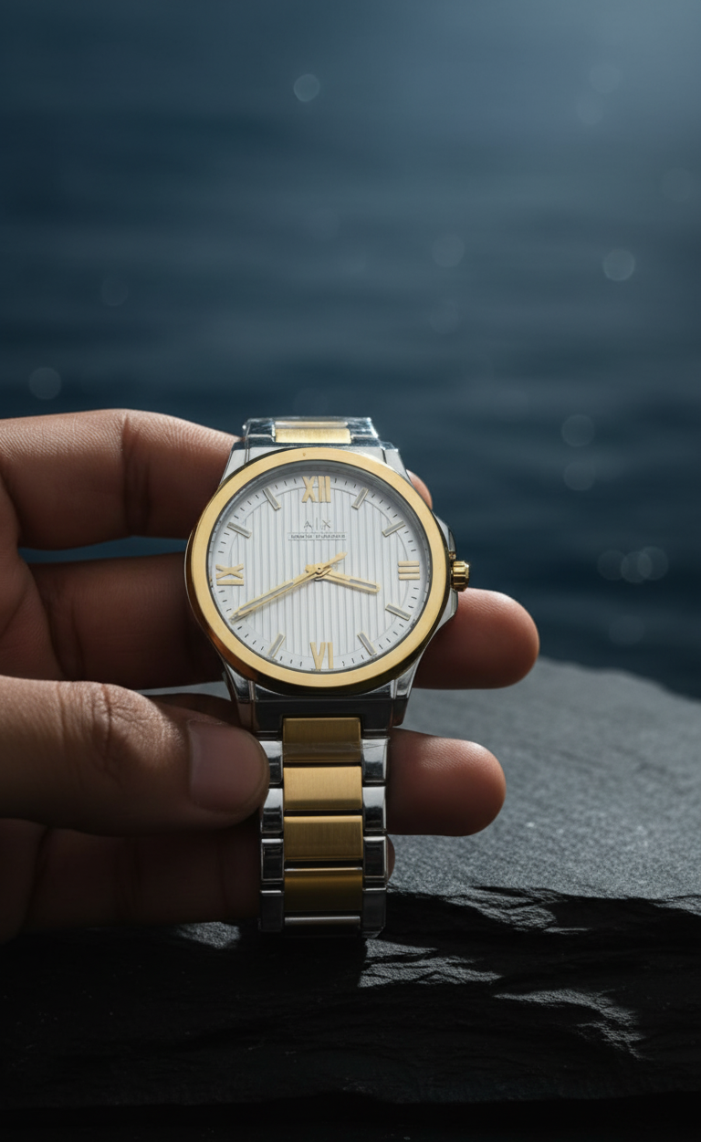 Elevate your style with this Armani Exchange Two-Tone Wrist Watch, a perfect blend of luxury and sophistication. Designed for the modern gentleman, this timepiece features a silver dial with elegant vertical detailing and Roman numeral hour markers that exude timeless class.